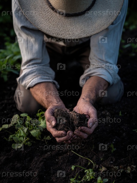 Безликий фермер держит плодородную почву с корнями в органическом поле, подчеркивая устойчивое сельское хозяйство, регенерацию и образ жизни сельского хозяйства