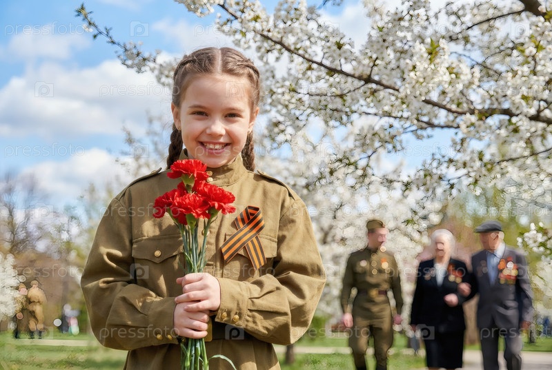 Концепция праздника 9 мая.Портрет девушки в военной форме с ленточкой Святого Георгия и красными гвоздиками, отмечающей День Победы в 1941-1945 годах