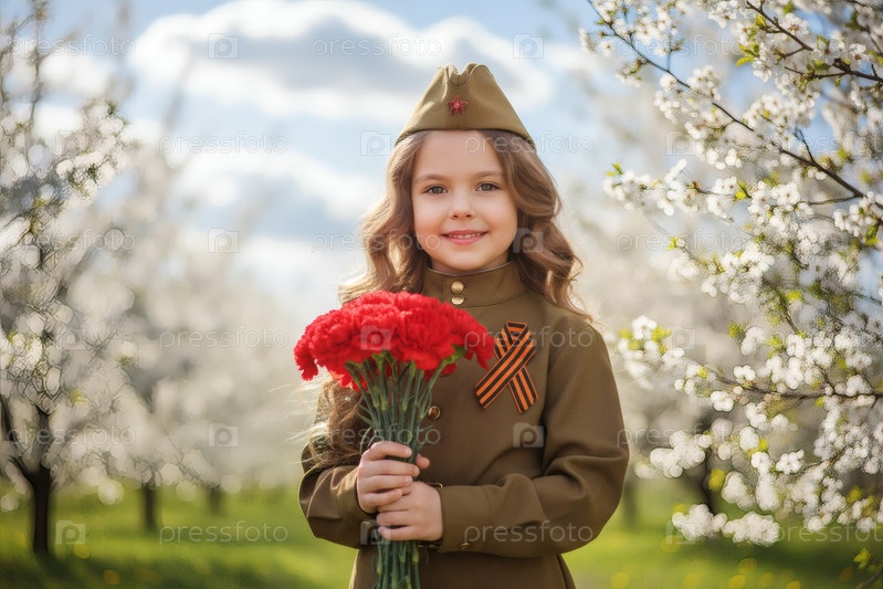 Концепция праздника 9 мая.Портрет девушки в военной форме с ленточкой Святого Георгия и красными гвоздиками, отмечающей День Победы в 1941-1945 годах