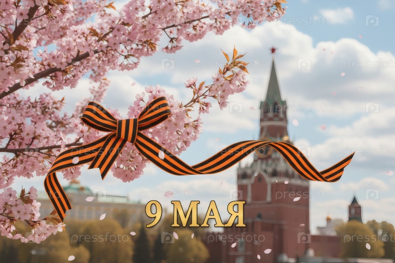 Знамя на 9 мая.Свято-Георгиевская лента и вишневый цветок.Концепция Дня Великой Победы 1941-1945 годов и День защитника Отечества