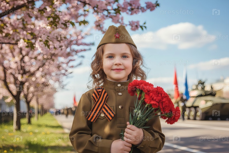 Концепция праздника 9 мая.Портрет девушки в военной форме с ленточкой Святого Георгия и красными гвоздиками, отмечающей День Победы в 1941-1945 годах