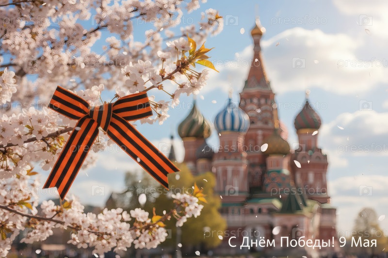 Знамя на 9 мая.Свято-Георгиевская лента и вишневый цветок.Концепция Дня Великой Победы 1941-1945 годов и День защитника Отечества