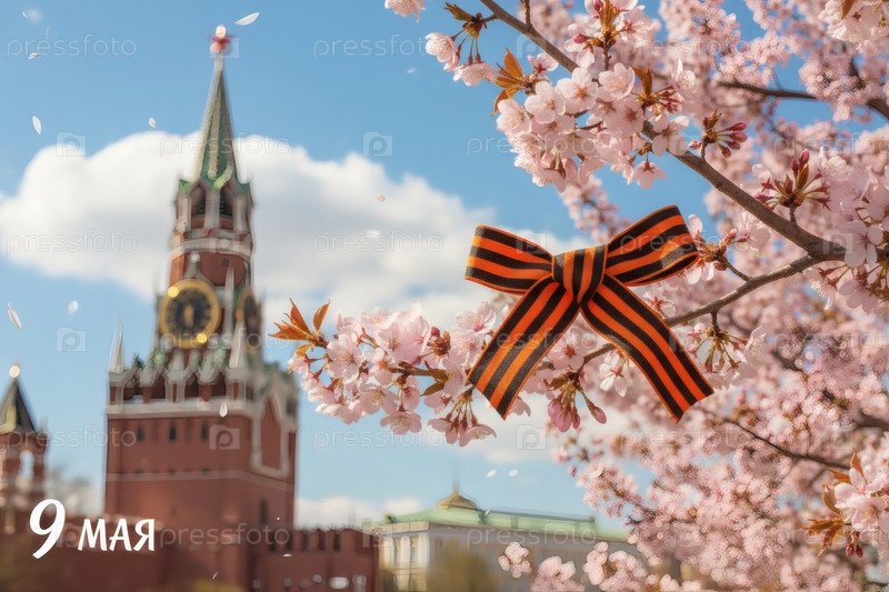 Знамя на 9 мая.Свято-Георгиевская лента и вишневый цветок.Концепция Дня Великой Победы 1941-1945 годов и День защитника Отечества