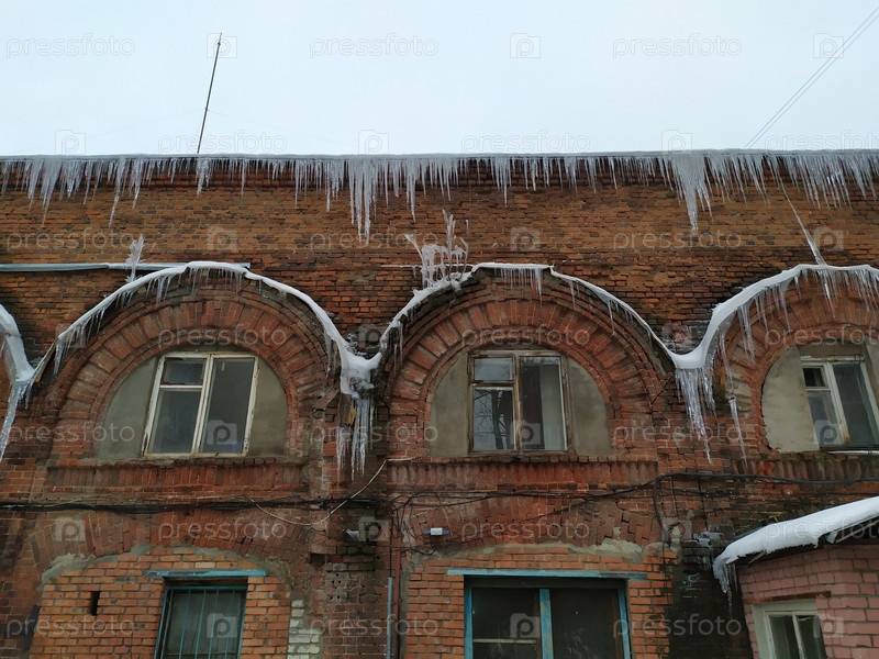 Опасные кусочки льда висят с крыши старого кирпичного дома