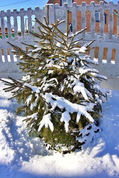 Ель в снегу на фоне забора