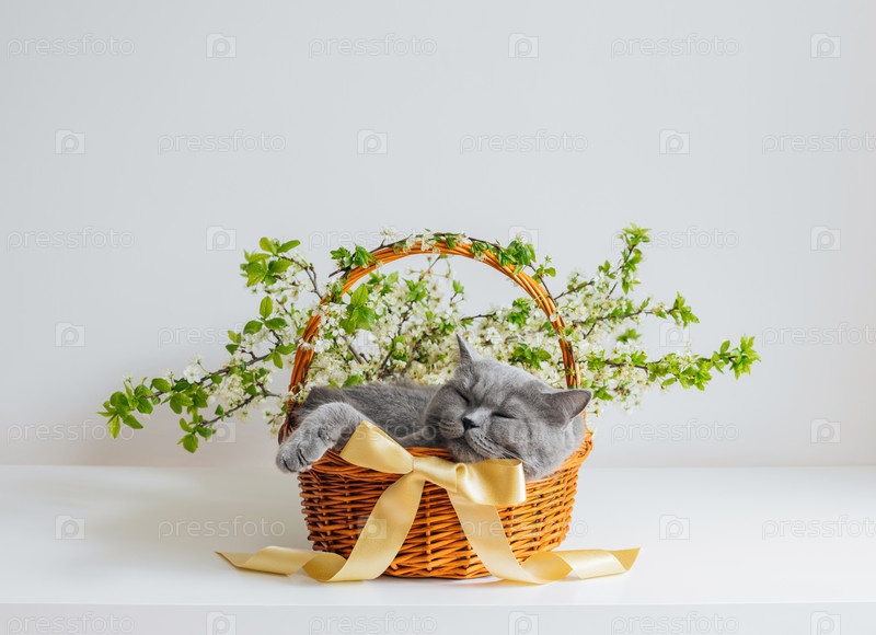 Британская кошка спит в корзине с цветами и поклоном на белом фоне.Прекрасная пасхальная композиция с милым котом.Забавные домашние животные