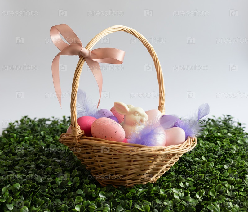 Пасхальная корзина с яйцами, кроликом и перьями на белом фоне
