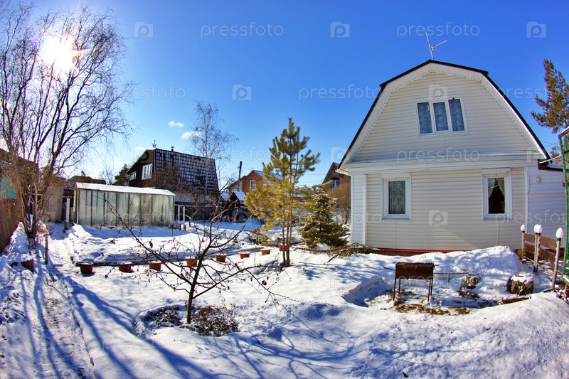 Дачный участок покрытый снегом ранней весной