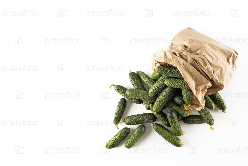 Свежие зеленые огурцы в бумажном пакете. Овощи для диетического питания. Здоровое питание. Экологически чистая упаковка овощей. Копировальное пространство. Изолированный объект