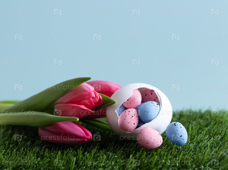 Пасхальные цветные яйца с тюльпанами в зеленой траве на синем фоне Красивая пасхальная композиция с маленькими красочными яичками в вылупленном курином яйце