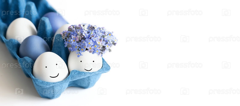 Пасхальные яйца с окрашенными лицами и цветами в синей картонной коробке на белом фоне