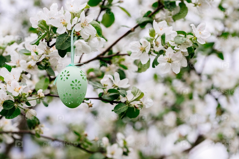 Зеленое пасхальное яйцо на цветущей яблоне
