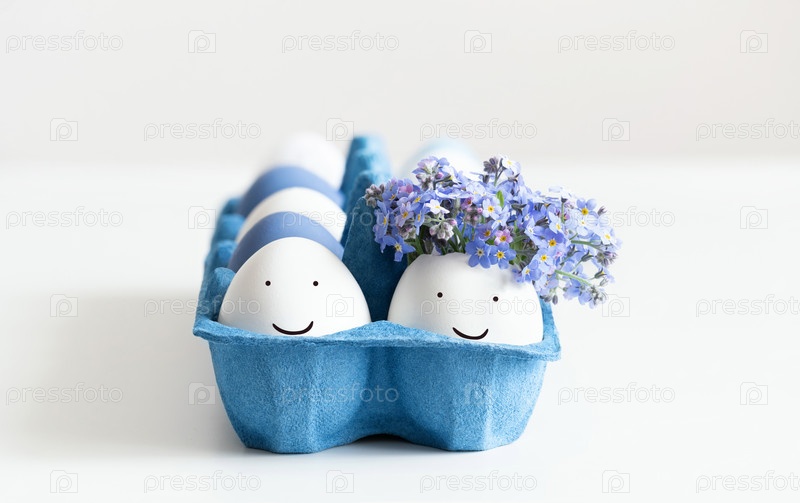Пасхальная композиция с яйцами в синей картонной коробке на белом фоне. пара забавных яиц с расписанными лицами и цветами