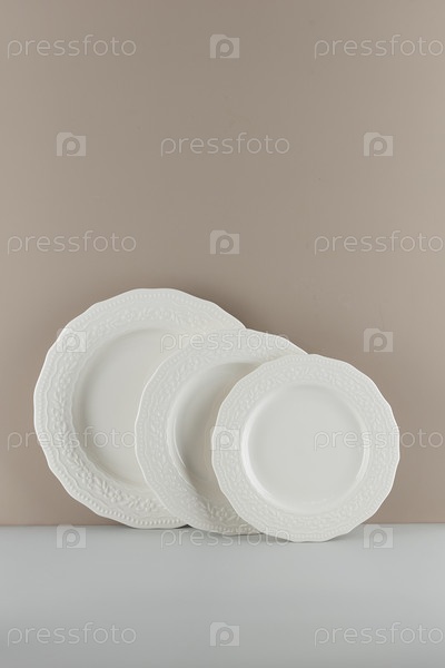 Несколько пустых белых столовых тарелок на бежевом фоне. Набор белого фарфорового блюда разных размеров на бежевом фоне. Лайм-аут для размещения рекламной информации и маркетинговых объявлений. Карта продукта