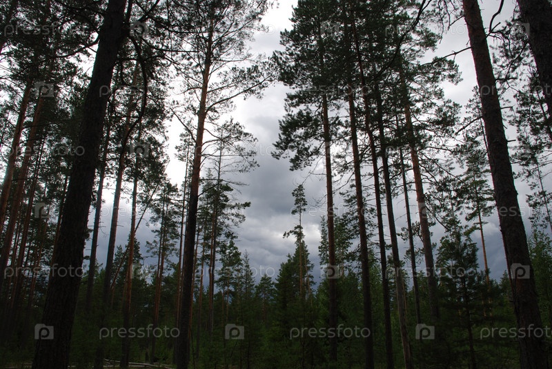 Небо над сосновыми деревьями. Летний день в лесу. Синее небо с облаками над вершинами высоких сосен. Деревья имеют длинные коричневые стволы с изогнутыми ветвями, на которых растут зеленые иглы и конусы