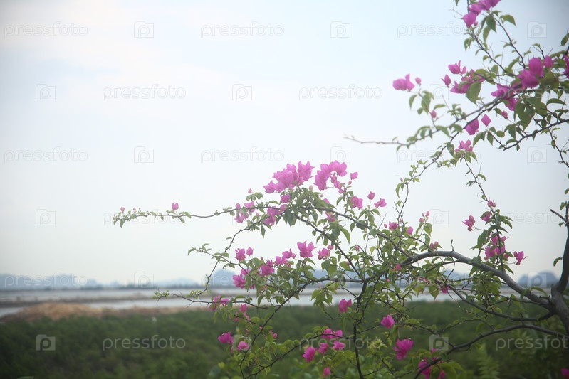 Розовые экзотические цветы на фоне моря крупным планом