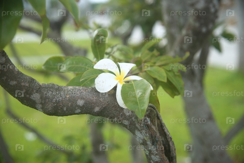 Белый экзотический цветок в саду на ветке