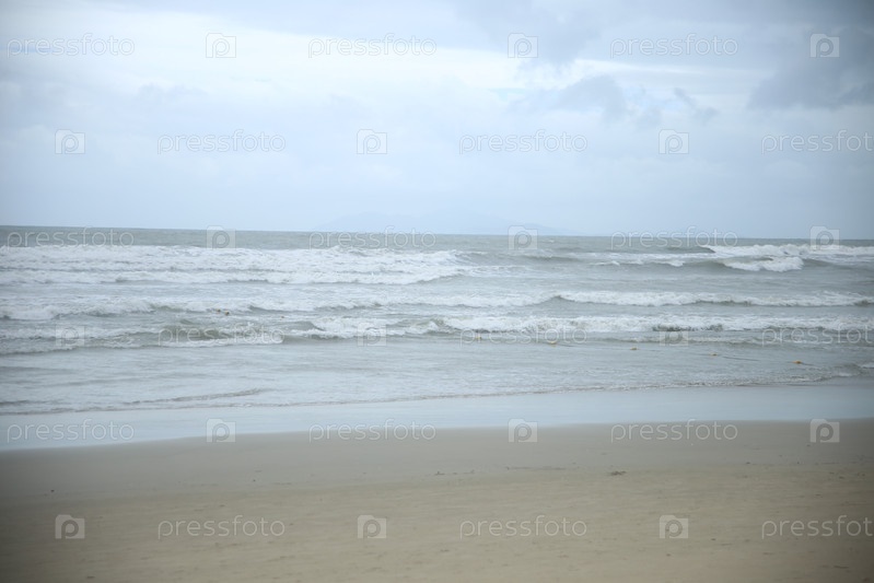 Пейзаж с видом на песчаный пляж, волны и синее небо на курорте