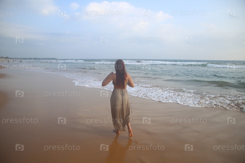 Пейзаж с видом на песчаный пляж и молодую девушку, идущую вдоль берега на курорте