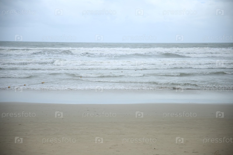 Пейзаж с видом на песчаный пляж, волны и синее небо на курорте