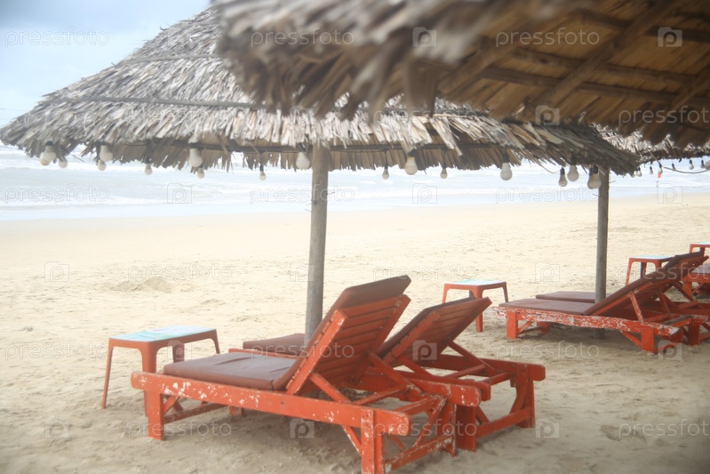 Пейзаж с видом на песчаный пляж, лежаки и зонтики на курорте