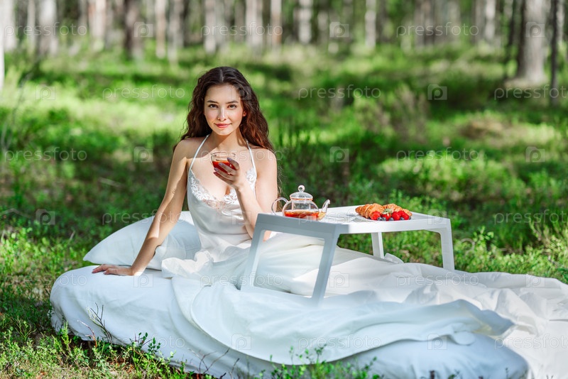 Молодая женщина завтракает в постели в летнем лесу
