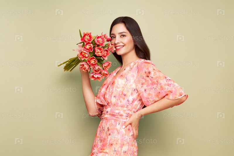 Счастливая женщина красоты с розовым букетом тюльпанов