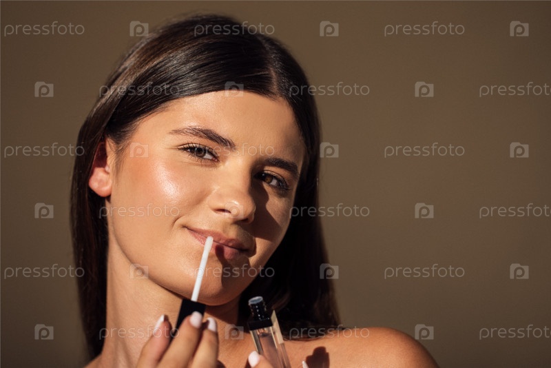 Молодая женщина наносит губный глянс щеткой, демонстрируя сияющую улыбку и светящуюся кожу, освещенную мягким естественным светом, подчеркивая красоту и самообслуживание