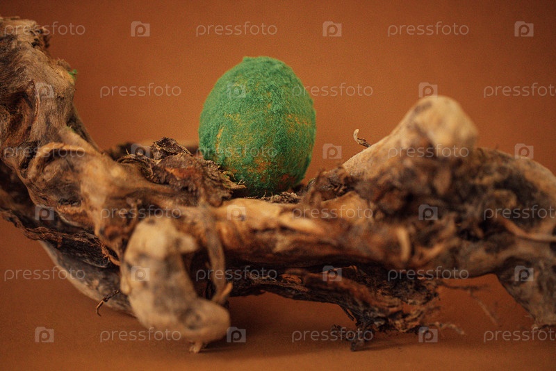 Зеленое текстурированное яйцо, размещенное на извилистом куске древесины дрифтового дерева на коричневом фоне, демонстрирует природные элементы и органические формы в минималистической композиции
