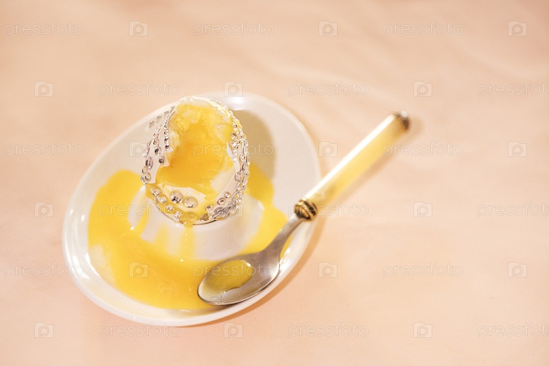 Яичный десерт с серебряной фольгой на белой тарелке, желтый соус мелькает вокруг, в сопровождении серебряной ложки на мягком пастельном фоне