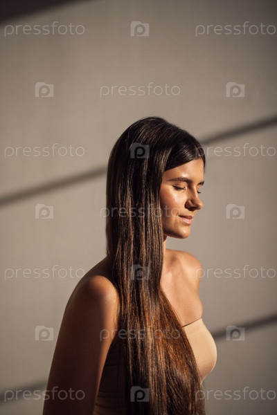 Молодая женщина с длинными темными волосами стоит в мягком свете, закрытые глаза, демонстрируя спокойное выражение и естественную красоту, причем тени создают успокаивающую атмосферу