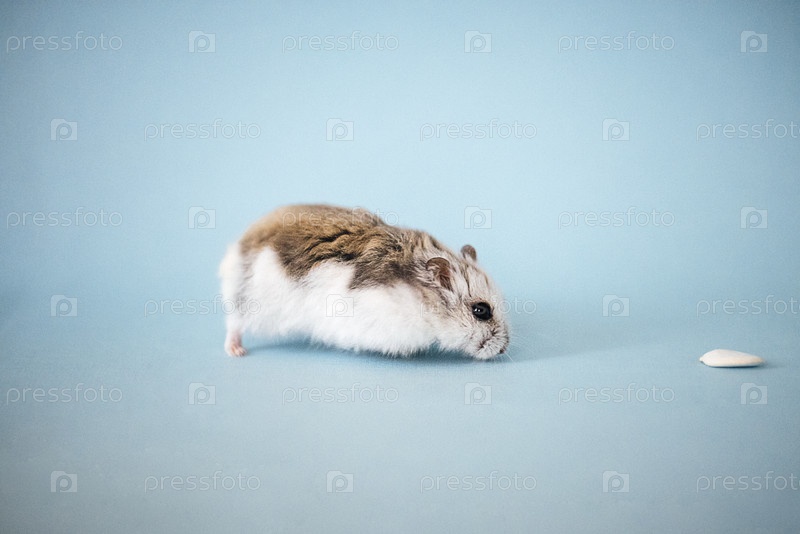 Хамстер с коричневой и белой шерстью исследует светло-синий фон, небольшой кусок пищи виден поблизости, демонстрируя его любопытную природу и маленький размер