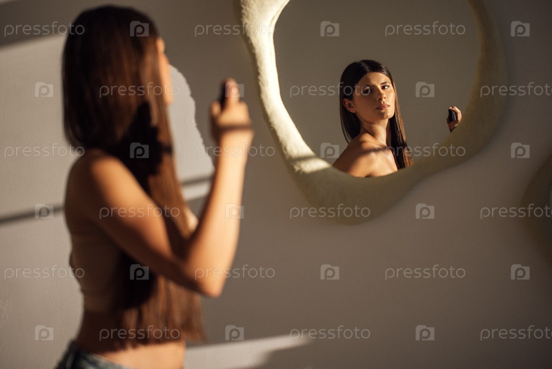 Молодая женщина с длинными темными волосами наносит парфюм перед уникальным зеркалом, отражая свой образ, демонстрируя привычку к красоте и самообслуживанию в спокойной обстановке