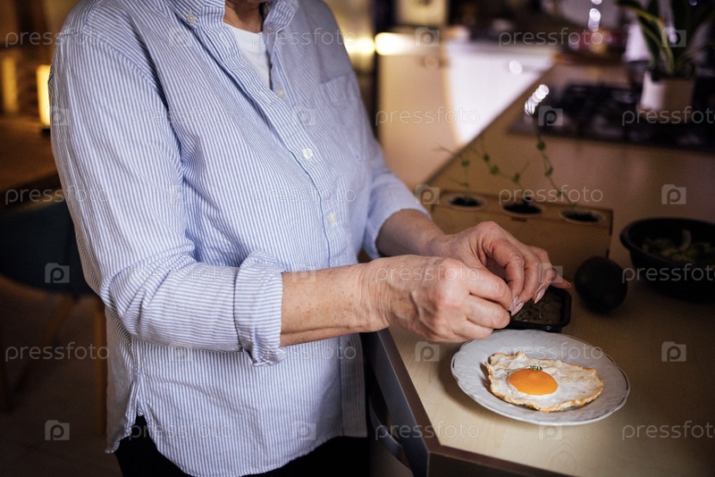 Пожилая женщина в синей полосатой рубашке готовит жареное яйцо на белой тарелке в современной кухне с столешницей и кухонными принадлежностями, видимыми на заднем плане
