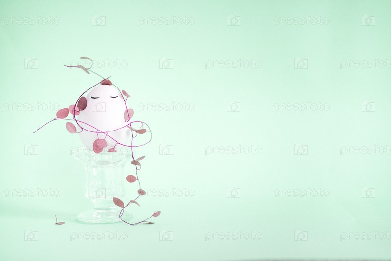 Декоративное розовое растение с улыбающимся лицом сидит на стеклянном пьедестале, окруженном лозами против мягкого зеленого фона