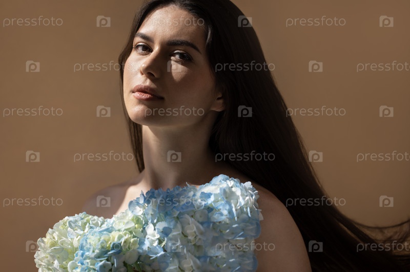 Молодая женщина с длинными темными волосами, украшенная цветочной аранжировкой голубых и белых гортензий, грациозно позирует на теплом нейтральном фоне, воплощая красоту и природу