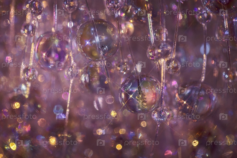 Близкий снимок сверкающих стеклянных бусин и кристаллов, висящих в декоративной композиции, отражающей красочный свет на мягком фиолетовом фоне