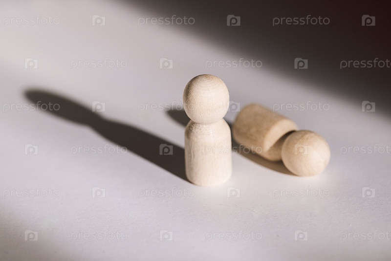 Деревянные статуэтки на светлой поверхности, одна из которых стоит прямо, а другая лежит на боку, бросают отчетливые тени в минималистической обстановке