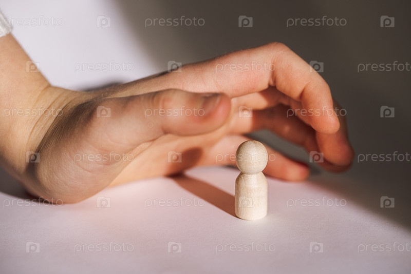 Рука тянется к маленькой деревянной статуэтке на белой поверхности, мягкие тени создают минималистичную и чистую эстетику в хорошо освещенном окружении