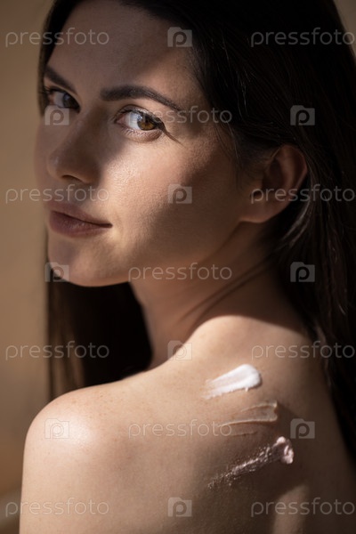 Красивая женщина с длинными темными волосами, демонстрирующая продукты по уходу за кожей на плече, освещенная мягким естественным светом, подчеркивающая красоту и самообслуживание в спокойной обстановке