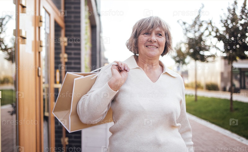 Пожилая женщина с седыми волосами, одетая в белый свитер, несет сумку для покупок во время прогулки за пределами современного здания со деревьями и зеленью на заднем плане