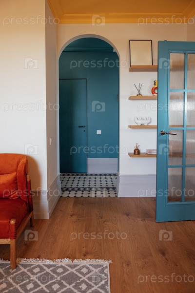 Современный дизайн интерьера с уютным оранжевым креслом, яркой синей дверью и стильными элементами декора, создавая теплую и приглашающую атмосферу в копировальном пространстве