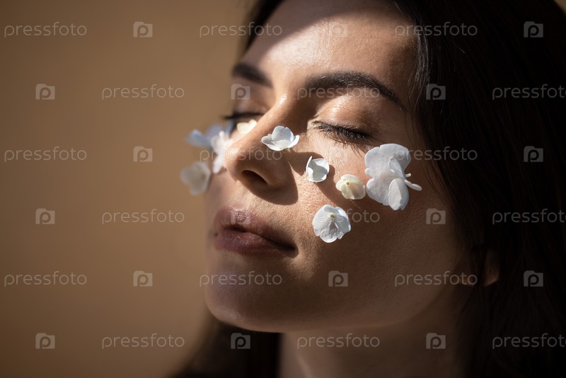 Женщина с закрытыми глазами, украшенная нежными белыми цветами на лице, греется в мягком естественном свете, воплощая спокойствие и красоту в безмятежной атмосфере