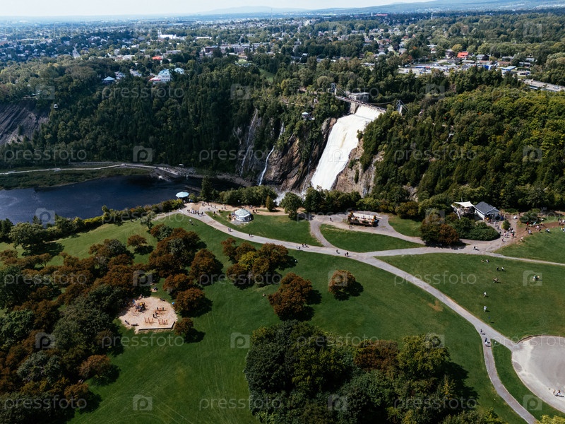 Вид с воздуха на водопад Монморенси-Фоллс недалеко от Квебека с драматическими скалами, лесом и текущей рекой