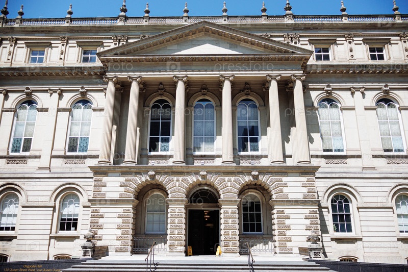Историческое здание суда Осгуд Холл с классической архитектурой, обрамленное деревьями в центре Торонто, Канада. g