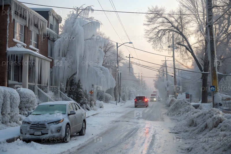 Замороженная улица после ледяной бури с автомобилями и домами, покрытыми льдом зимой в Канаде или США