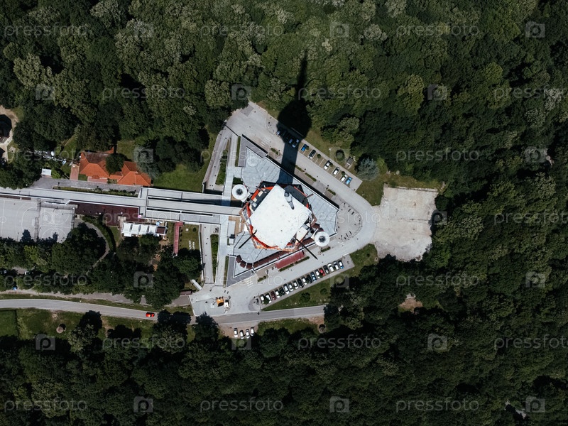 Вид с воздуха Авальской телебашни, возвышающейся над зеленым лесом недалеко от Белграда в Сербии