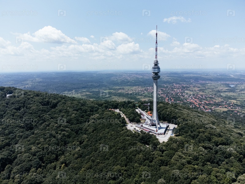Вид с воздуха Авальской телебашни, возвышающейся над зеленым лесом недалеко от Белграда в Сербии
