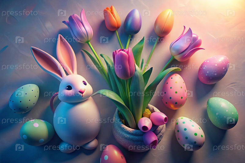 Пастельные пасхальные яйца, тюльпаны и милое украшение кролика на светлом фоне, весенние праздники плоская композиция. g