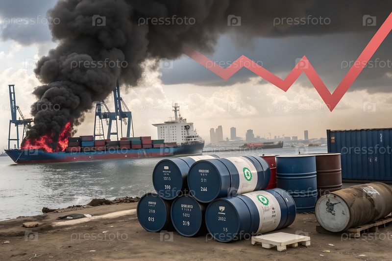 Редакционная иллюстрация энергетического конфликта США, баррелей нефти и горящего НПЗ, символизирующих геополитическую напряженность и войну